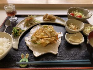 本日は、メインは海の香りと畑の恵みを満喫できるかき揚げをほおばりながら、副菜には肉や野菜類の特長を活かした料理の数々で、自然の風と感じながらゆったりとしていただくようなランチに仕上がりました。