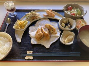 本日は、メインは大葉とチーズと梅をささ身で挟んで揚げたヘルシーなカツをほおばりながら、副菜には魚介や海藻や野菜類を取り合わせた料理の数々で、海の香りや畑の恵みを存分に愉しみ味わい尽くすようなランチに仕上がりました。