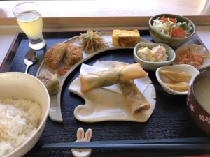 「春巻き2種、レンコンのはさみ揚げ、ロールキャベツ、玉子焼き、人参たらこ、ポテトサラダ、きんぴら、野菜サラダ、ミックスゼリー、漬物、ごはん、みそ汁」