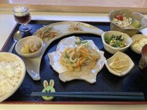 本日は、メインは海の香りと畑の恵みをたっぷりと愉しめるかき揚げをいただきながら、副菜には相性のいい食材で肉の旨みを引き出した料理の数々で、心も身体も満足感に浸れるようなランチに仕上がりました。