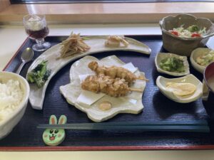 本日は、メインは豚肉と相性のいいねぎを挟んで揚げた串カツをほおばりながら、副菜には野菜類を中心とした料理の数々で、ピリ辛感もおり混ぜたすっきり爽やか感覚のランチに仕上がりました。