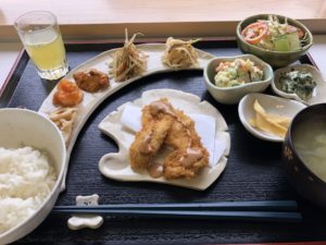 「チキンカツ、レンコンのきんぴら、エビチリ、白和え、切り干し大根のいため、ポテトサラダ、きんぴら、野菜サラダ、ミックスゼリー、漬物、ごはん、みそ汁」
