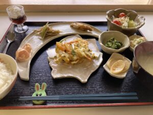 本日は、メインは海の幸と畑の恵みがたっぷり入ったかき揚げをかぶりつきながら、副菜には肉・野菜・魚介・海藻を取り入れた料理の数々で、食感やコクうま感や爽やか感を存分に愉しみ尽くすようなランチに仕上がりました。