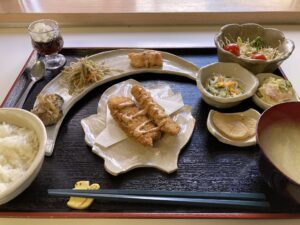 本日は、メインは衣の中にたっぷりと旨みを閉じ込めた柔らかカツをかぶりつきながら、副菜には魚介や肉をおり混ぜた料理の数々で、コクうまと爽やか感がコラボしたようなランチに仕上がりました。