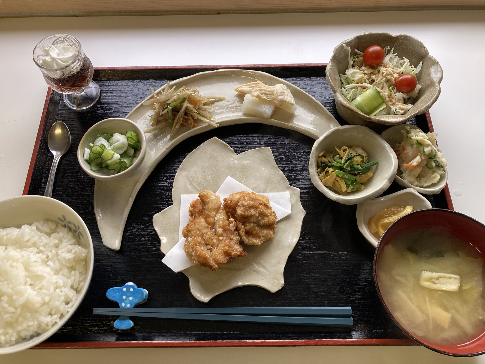 「春巻き2種、手羽中の甘炒め、大根と厚揚げの煮もの、ほうれん草のじゃこ和え、ポテトサラダ、きんひ、野菜サラダ、コーヒーゼリー、漬物、ごはん、みそ汁」