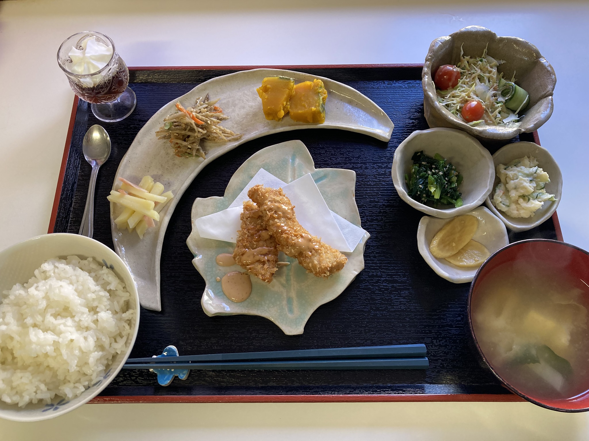 「コロッケ、切り干し大根、野菜の揚げびたし、ほうれん草のごま和え、ポテトサラダ、きんぴら、野菜サラダ、コーヒーゼリー、漬物、ごはん、みそ汁」