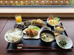 鶏の唐揚げ、ちくわともやしの天ぷら、ひじき、なすびの豚和え、酢の物、きんぴら、ポテトサラダ、野菜サラダ、オレンジゼリー、漬物、ごはん、みそ汁