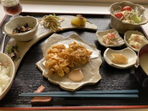 本日は、メインはパリパリ衣で旨みたっぷりの鶏フライをほおばりながら、副菜には絶妙な相性の良さを引き出した料理の数々で、どこか懐かしく田舎風味も味わえるようなランチに仕上がりました。