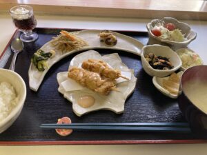 本日は、メインは豚肉をねぎで挟んで揚げたカツをほおばりながら、副菜には野菜や海藻や肉の相性を活かした料理の数々で、自然界の風味を満喫できるようなランチに仕上がりました。