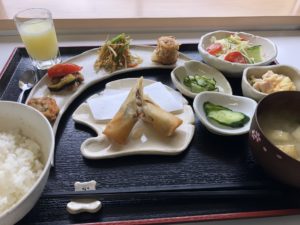 「春巻き、ちくわのもやし詰め、ナスとトマトの牛肉炒め、きゅうりの酢の物、ハンペンとすり身のツキアゲ、ポテトサラダ、きんぴら、野菜サラダ、バナナゼリー、漬物、ごはん、みそ汁」