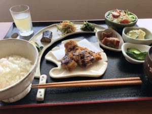 「ひれかつ、ねぎとあさりの酢ぬた、酢豚、なすの揚げ浸し、ほうれん草の卵和え、ポテトサラダ、きんぴら、野菜サラダ、ミックスゼリー、漬物、ごはん、みそ汁」
