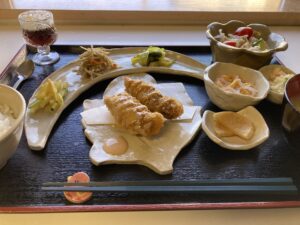 本日は、メインは大葉とチーズと梅を豚肉で巻いて揚げたカツを豪快にかぶりつきながら、副菜にはさわやか感とシャキシャキ感たっぷりの料理の数々で、それぞれの素材の食感やできあがった料理のコクうま感を存分に愉しめるようなランチに仕上がりました。
