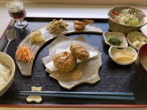 本日は、メインはホクホクじゃがいもの定番コロッケをほおばりながら、副菜には肉あり、野菜あり、海藻あり、きのこありの料理の数々で、自然の恵みを味わい尽くすようなランチに仕上がりました。