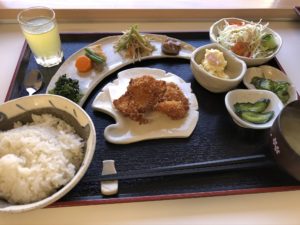 「ささ身フライ、ほうれん草のごま和え、牛肉とサツマイモの煮物、煮しめ、きゅうりの酢の物、ポテトサラダ、きんぴら、野菜サラダ、ミックスゼリー、漬物、ごはん、みそ汁」