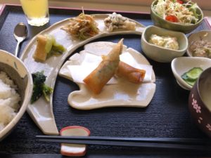 「春巻き、舞茸のチーズフリット、ちんげん菜の油炒め、なすのそぼろあんかけ、ほうれん草のごま和え、ポテトサラダ、きんぴら、野菜サラダ、ミックスゼリー、漬物、ごはん、みそ汁」