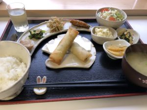 「春巻き、豚みそ、ほうれん草と卵の和えもの、酢ぬた、手羽中の甘煮、ポテトサラダ、きんぴら、野菜サラダ、アップルゼリー、漬物、ごはん、みそ汁」