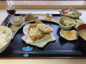 本日は、メインは野菜たっぷりのタルタルソースをかけたヘルシー鶏カツをほおばりながら、副菜には魚介をおり混ぜた料理の数々で、海の香りと優しい味に包まれながらいただくようなランチに仕上がりました。